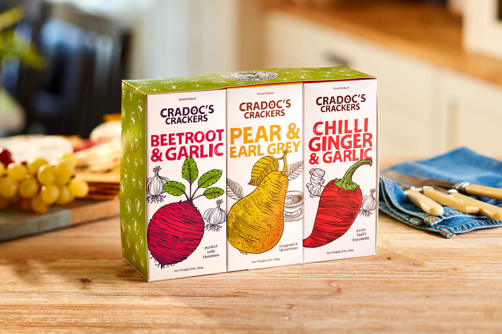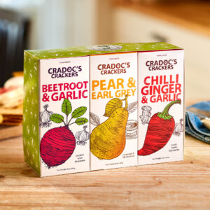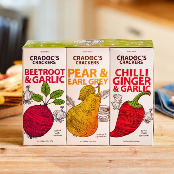 A pack each of Beetroot and Garlic, Pear and Earl Grey, Chilli, Ginger and Garlic. Thoughtfully packaged together in a green band with a Butterfly design, ideal for Spring and Summer Holiday gifts. Christmas/Winter band with snowflakes on a red background available on request.